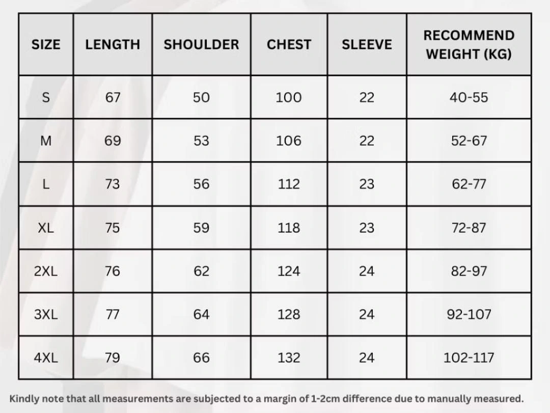 | Size | S, M, L, XL, 2XL, 3XL, 4XL |